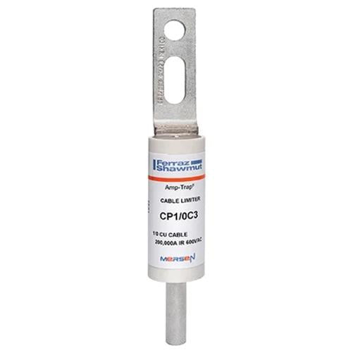 Mersen CP Cable Protectors are special purpose limiters which are crimped or bolted to cables or terminals to clear and isolate faults quickly, increasing the reliability of service entrance and distribution runs. CP Cable Protectors have a 200,000A interrupting rating, yet will carry low cable overloads which are handled by standard protective devices. Cable protectors are rated in terms of cable size and material (Al or Cu). Heavier duty CPH cable protectors are available on special order. Heat shrinkable (HS) tubing can be specified for field installation. TI blown fuse trigger indicators may be available upon request. Refer to the application information section for more information.