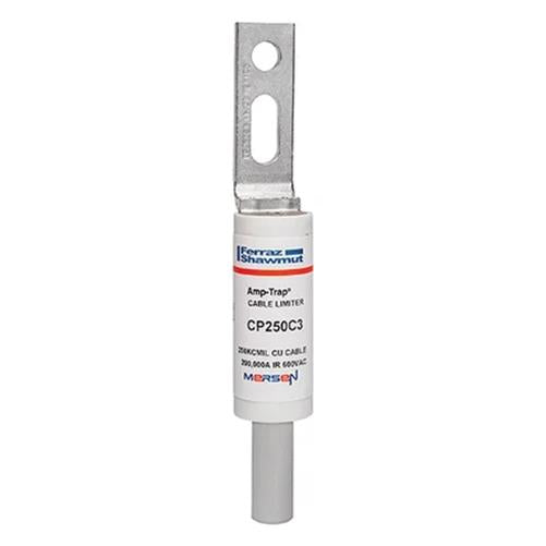 Mersen CP Cable Protectors are special purpose limiters which are crimped or bolted to cables or terminals to clear and isolate faults quickly, increasing the reliability of service entrance and distribution runs. CP Cable Protectors have a 200,000A interrupting rating, yet will carry low cable overloads which are handled by standard protective devices. Cable protectors are rated in terms of cable size and material (Al or Cu). Heavier duty CPH cable protectors are available on special order. Heat shrinkable (HS) tubing can be specified for field installation. TI blown fuse trigger indicators may be available upon request. Refer to the application information section for more information.