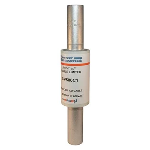 Mersen CP Cable Protectors are special purpose limiters which are crimped or bolted to cables or terminals to clear and isolate faults quickly, increasing the reliability of service entrance and distribution runs. CP Cable Protectors have a 200,000A interrupting rating, yet will carry low cable overloads which are handled by standard protective devices. Cable protectors are rated in terms of cable size and material (Al or Cu). Heavier duty CPH cable protectors are available on special order. Heat shrinkable (HS) tubing can be specified for field installation. TI blown fuse trigger indicators may be available upon request. Refer to the application information section for more information.