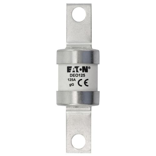 Bussmann DEO Series is a British Standard (BS88) fuse links designed for general industrial and motor applications. These are high rupture capacity (HRC) fuses with offset bolted tags, featuring characteristics like good peak let-through current limitation and specific gG/gL utilization categories for general equipment protection. They are suitable for 415V AC systems and have an 80 kA breaking capacity.