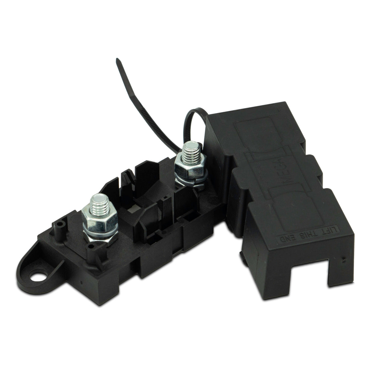 The Littelfuse MEGA® 298 Bolt-Down Series HighCurrent Fuse Holder works with MEGA® bolt-down fuses. As a high-amp fuse holder, it’s ideal for battery and alternator connections as well as providing ultra-highcurrent protection for other types of heavy gauge cables. Interlocking pins on the sides let you connect additional MEGA® 298 Bolt-Down Series fuse holders for multi-fuse applications.